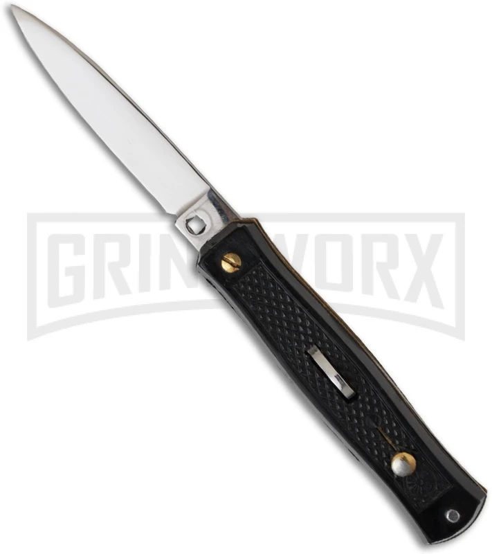 This Gimel-Bargeon Small Stiletto knife has great automatic action and stellar looks. It has a polished flat ground blade and textured handle with brass liners and sliding safety. Nice, rare small pocket-sized knife.