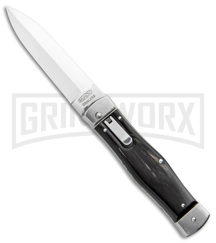 The Mikov 241 automatic knives come from the Czech Republic. This model features dark horn scales and a dagger-style stainless blade (one side is sharp and the other is a false edge) and double bolsters. The Mikov series is well-regarded for their “ready to work” no nonsense design. Rivet construction. The knife is opened using the small lever near the top of the knife. The lever rests flush in the handle when not in use.