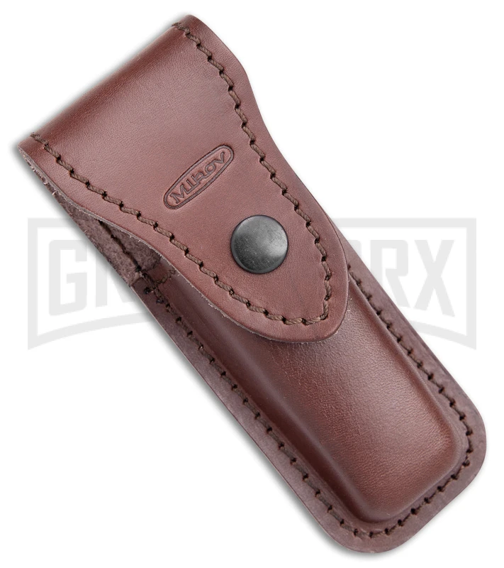 The Mikov automatic knives come from the Czech Republic. This model features dark horn scales and a dagger-style stainless blade (one side is sharp and the other is a false edge). The multi-tool version of the Predator features a knife blade, bottle opener, and a can opener. The Mikov series is well-regarded for their “ready to work” no nonsense design. Rivet construction. The knife is opened using the small lever near the top of the knife. The lever rests flush in the handle when not in use.