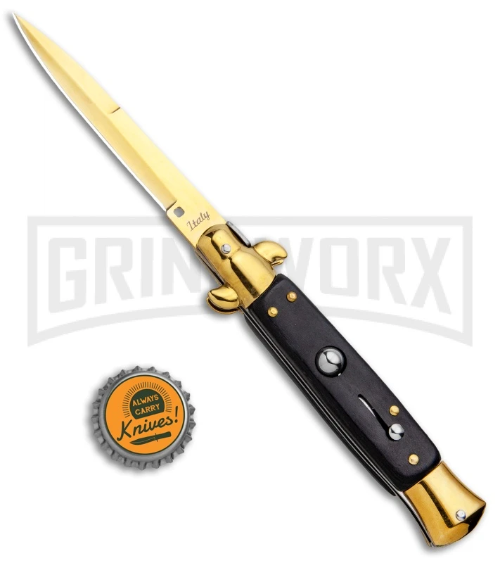 The Milano Stiletto offers a classic automatic knife design that’s easily affordable for anyone interested in Italian style knives. It’s built with a stainless steel bayonet blade and a black wood handle with stainless steel bolsters. The push button release has fast action and a solid lock up. To unlock the blade, simply push down on the swivel bolster. Item is equipped with a sliding safety to protect against accidental release of the blade. The Milano Stiletto is a great way to get your collection started.