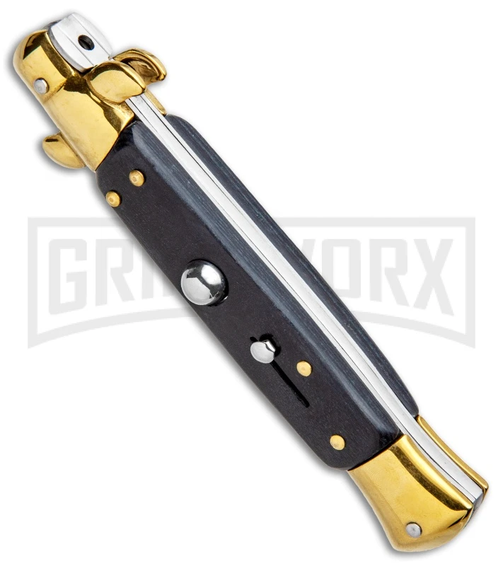 This Milano model has a gold finished bayonet blade and a black wood handle.