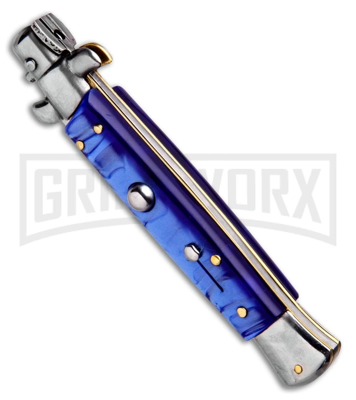 SKM 9″ Marble Blue Acrylic Automatic Stiletto Knife – Satin Bayonet
