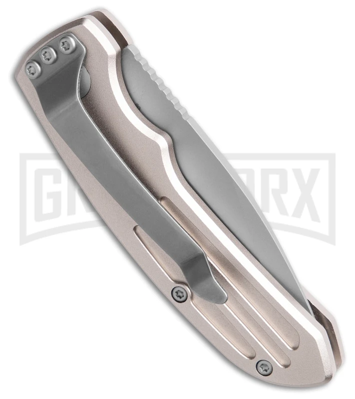 If you like the Boker Magnum series, then you’ll love the Extreme Ops. This is a knife with great quality and action at a low price. The bead-blasted 440 stainless steel Tanto blade is non-reflective. The champagne color anodized aluminum handles feature grooves to increase grip and help keep this knife lightweight. The satin firing value has a firm release and the blade locks in tight. The stainless steel, bead-blast pocket clip is tip-down for easy carry.
